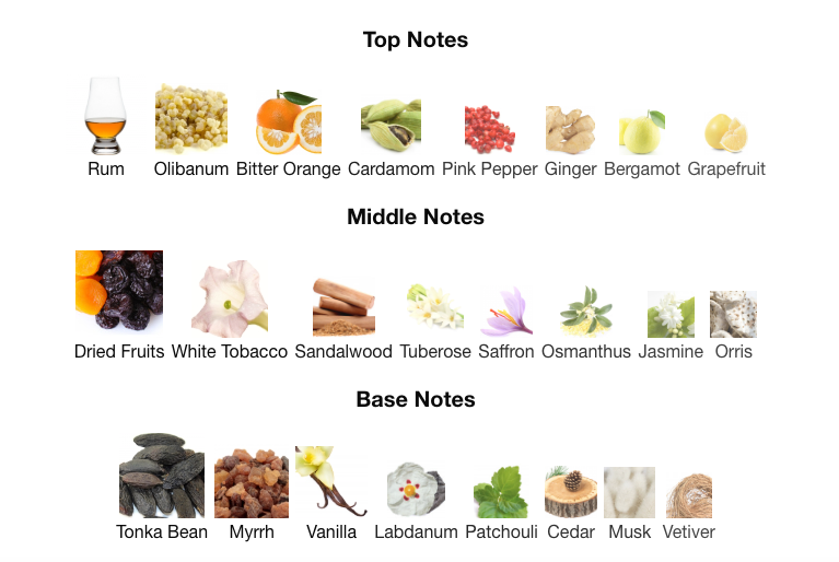 Heart: The heart reveals an intoxicating blend of floral and spicy notes, including tuberose, jasmine, saffron, and osmanthus. The dried fruits and white tobacco add a smoky, almost leathery richness, making the scent feel luxurious and opulent. Sandalwood and orris root lend smooth, creamy textures, making the middle phase of the fragrance both rich and refined.