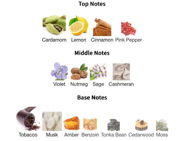 The dry-down settles into smoky woods, amber, resins, tobacco leaf, cedarwood, benzoin, musk, tonka bean, and moss—rich, elegant, and reminiscent of a gentleman’s club warmed by embers and leather