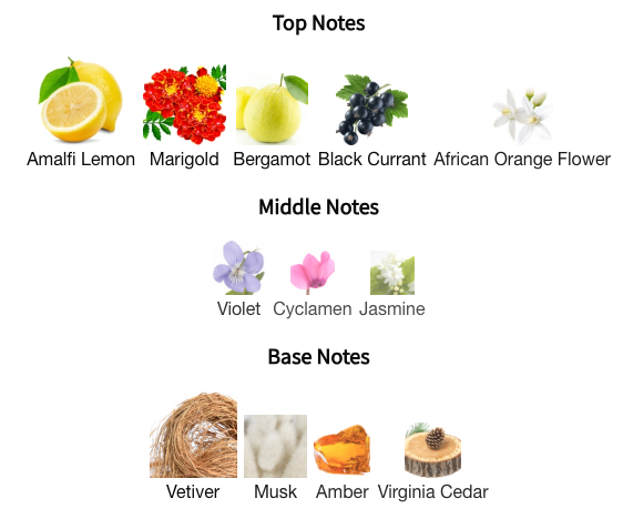 The fragrance opens with a bright and slightly zesty blend of Amalfi lemon, bergamot, neroli, and African marigold, immediately conjuring the feeling of a sunlit afternoon. As it settles, the heart reveals soft violet, jasmine, and cyclamen, bringing a delicate floral texture. The base grounds the experience with smooth vetiver, black amber, Moroccan cedarwood, and musk, adding a subtle woodiness and depth that lingers like a gentle memory.
