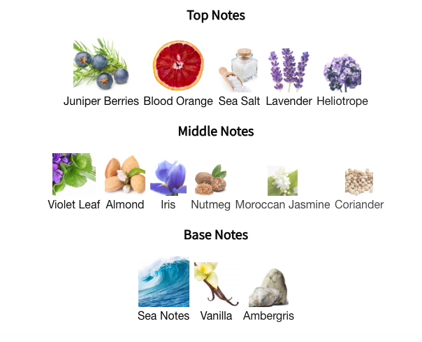 Heart: As the fragrance develops, the heart reveals a warm, aromatic mix of nutmeg, coriander seed, and almond, evoking the spirit of a lively beachside cafΓ©. Moroccan jasmine and violet leaves add a subtle floral elegance, while iris brings a powdery softness that enhances the overall complexity.