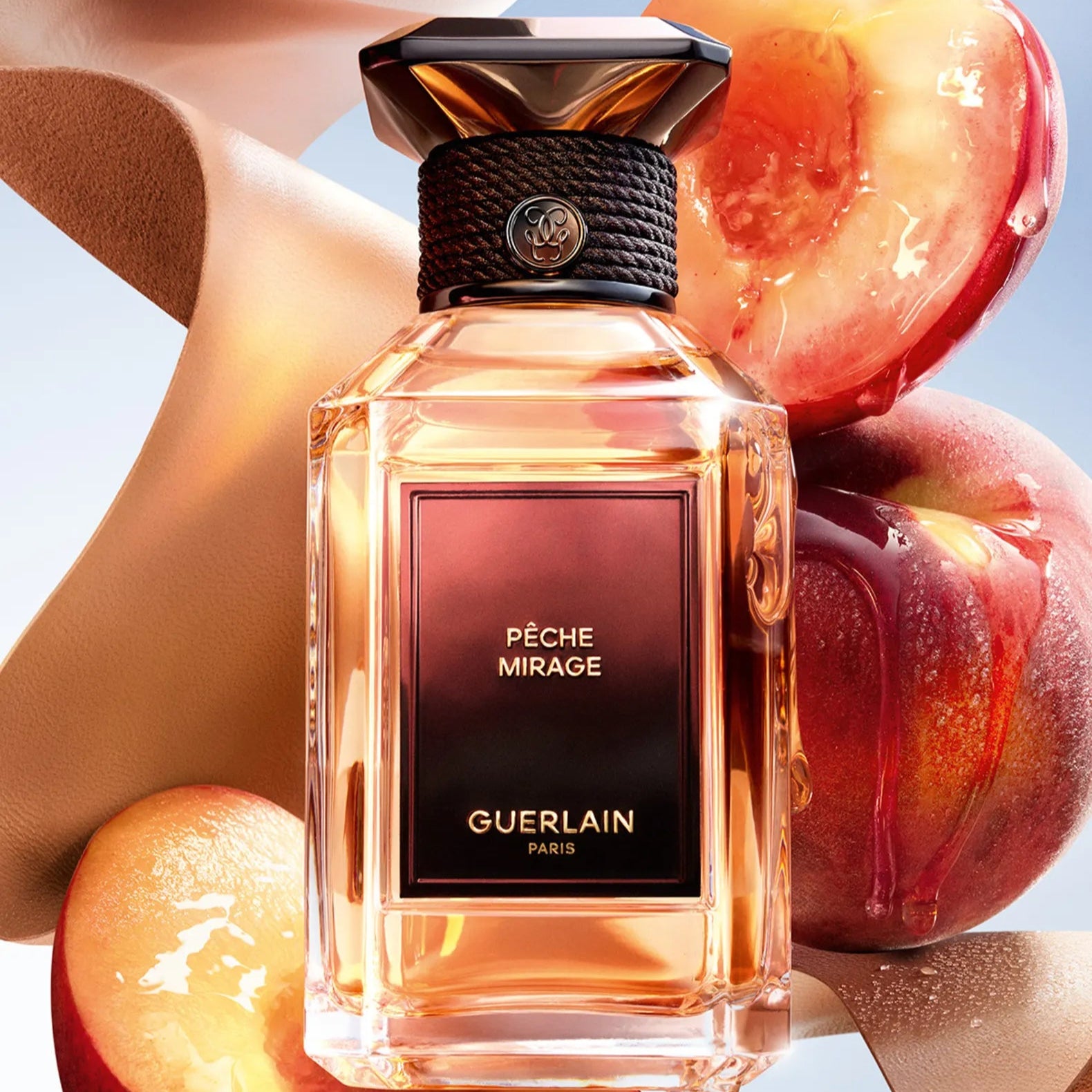 Pêche Mirage is an elegant mirage of contrasts—where luscious fruit meets leather and amber in a dreamy blur of light and shadow. Inspired by the illusionary beauty of a desert oasis, this fragrance explores the tactile allure of peach, not as a syrupy fruit but as a velvet-textured, quietly hypnotic presence. It’s a refined take on sensuality, rendered in Guerlain’s signature house style of depth, sophistication, and restraint.