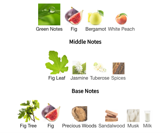Heart: As the scent unfolds, the fig theme deepens. Fig leaf—both green and black—adds a slightly bitter, herbal edge that contrasts beautifully with the creamy sweetness of ripe fig. The floral presence of jasmine and tuberose weaves a delicate sensuality into the composition, while warm spices add a subtle complexity that keeps the fragrance intriguing.