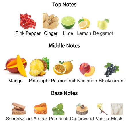 As the citrus fades, the fragrance blossoms into a juicy, mouthwatering blend of mango, passionfruit, pineapple, nectarine, and blackcurrant. This vibrant mix is sweet yet tangy, rich yet airy, painting an image of golden sunsets, lush island landscapes, and the carefree indulgence of a tropical getaway.
